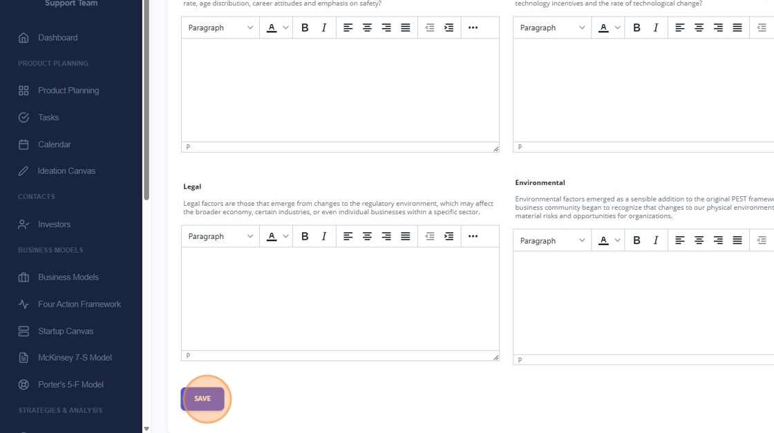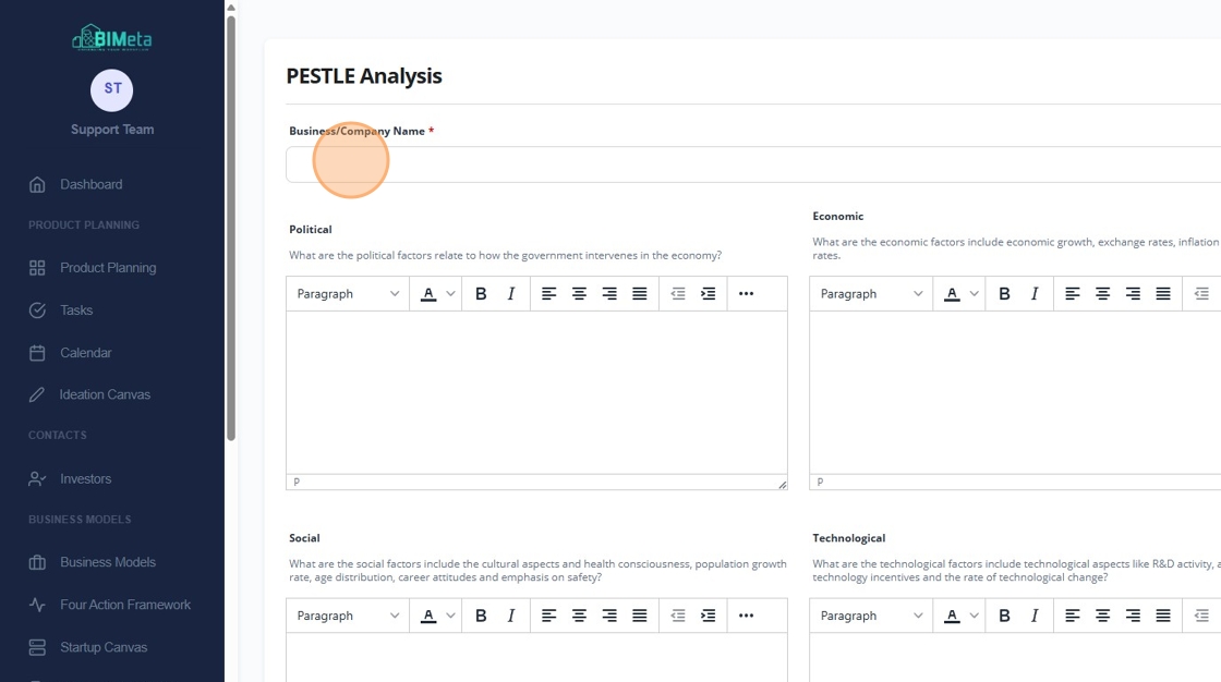 1. Navigate to https://startup.bimeta.net/four-action-framework 2. Click "Four Action Framework" 3. Click "Create New Four Action Framework" 4. Enter a Business/Company Name 5. Select the "Product" option. 6. Click "Save"