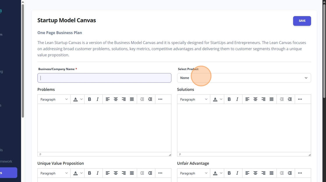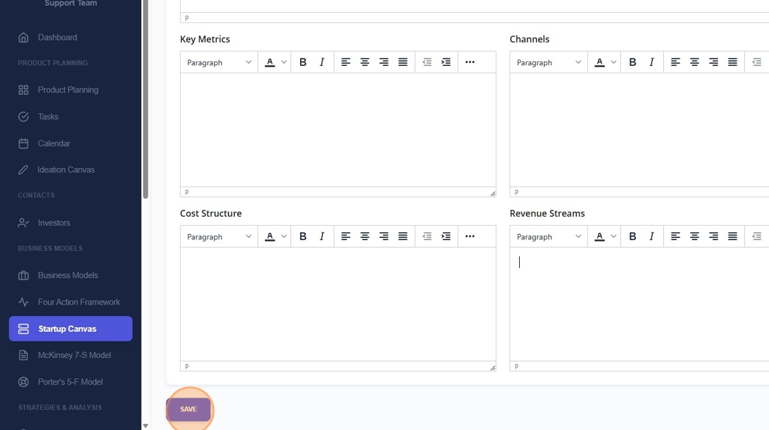6. And finally enter in a unique value proposition, unfair advantage, Customer segments, Key metrics, Channels, Cost structure, revenue streams, and then click save.