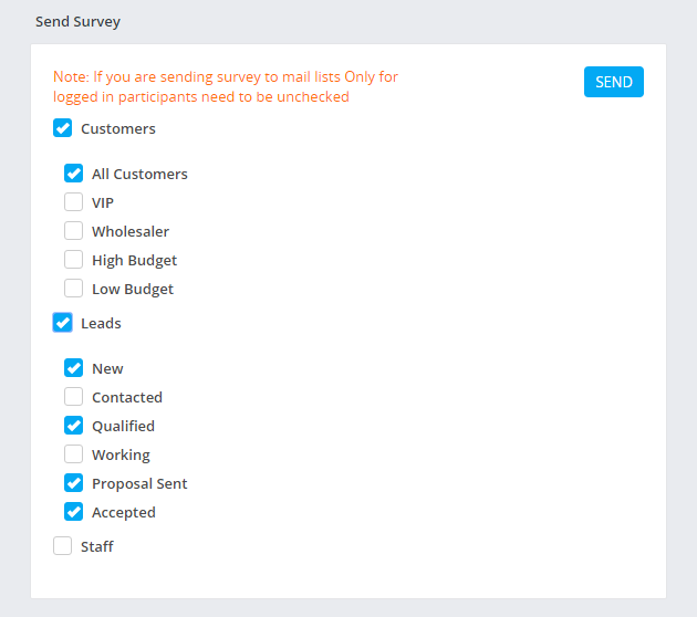 Se si invia un sondaggio agli elenchi di posta aggiunti personalizzati Solo per i partecipanti connessi deve essere deselezionato. Selezionare gli elenchi di posta su misura che si desidera inviare e fare clic sul pulsante Invia.
